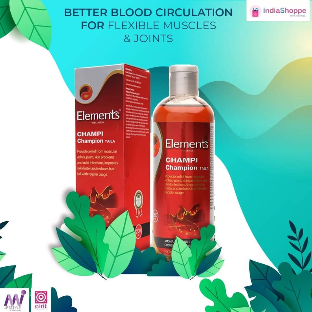 Elements Champi Champion Taila offers a unique rejuvenation process of massage of the body and its parts after application of medicated oils. The oil is processed by slowly boiling sesame oil with added herbs such as Masha and other ingredients which are good for hair, muscles and skin. Massaging skin using this oil promotes blood circulation, de-stress and improves the sense of well being, reduces stiffness and muscular pain, rejuvenates and tones the body. This oil can as well be used for massaging legs, face, hands and whole body.